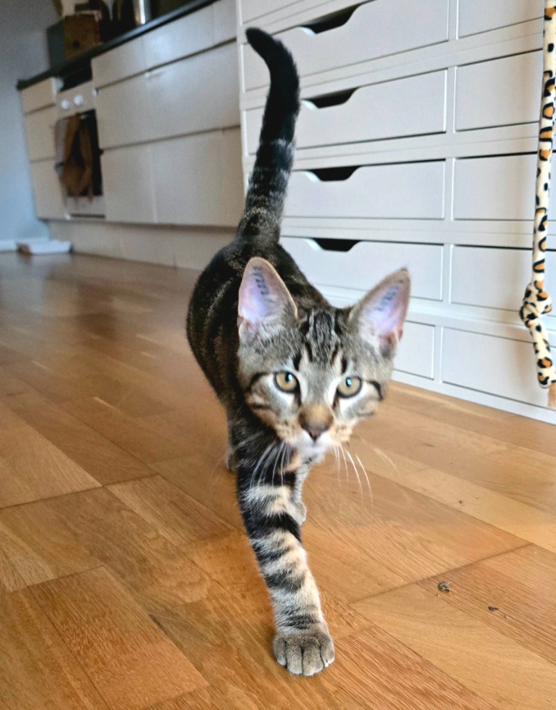 Mini er en legesyg og nysgerrig lille fyr, der gerne jagter både mus med små fjer såvel som snacks og ruller sig i både tæpper og dyner. Han kan ved første møde godt virke lidt genert, men som regel tager nysgerrigheden over, så han varm...