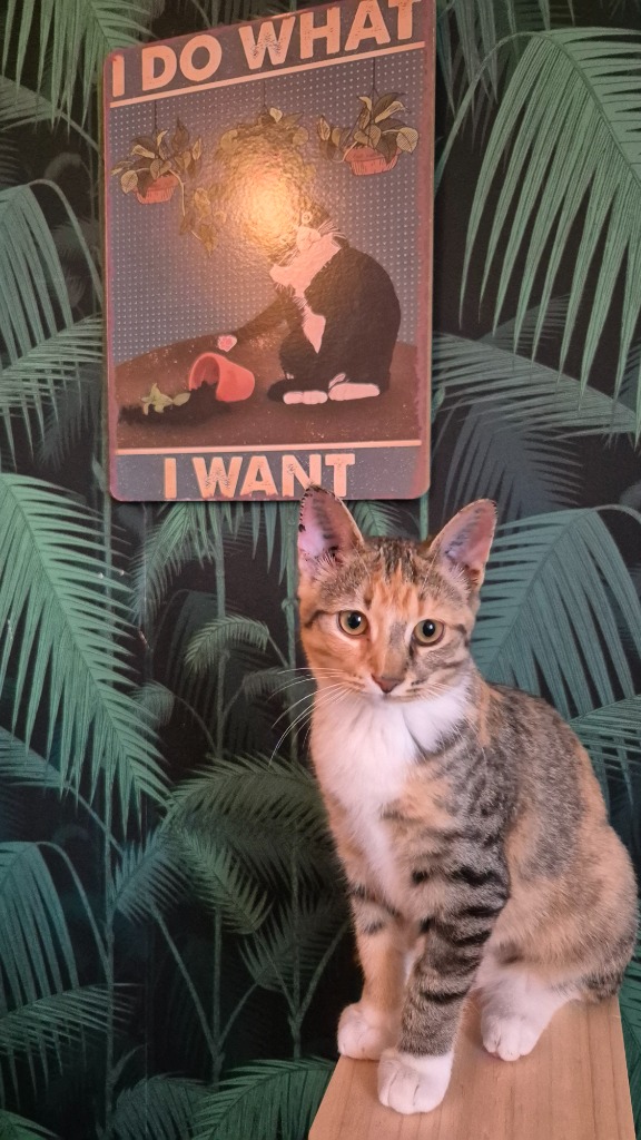 Oona er en ballademager, og der er fart på hende. Hun er en aktiv lille killing, der elsker at lege, jage spiraler rundt i tæpper, hoppe op og klatre i træ og løbe indtil hun nærmest falder om. Når hun endelig falder til ro, kan hun godt lid...