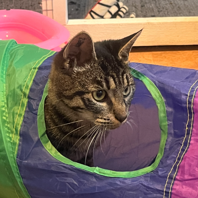 Stribe er en af de 4 katte, som blev dumpet i papkasser i Dragør. Hun vurderes til at være omkring 10 mdr, og vi mener Gråmis er mor til de 3 andre. Stribe er en helt almindelig huskat, som dog lige skal lærer dig at kende, men ellers kælen og legesyg. Hun er neutraliseret mm, og klar til at finde sit forever home, hvor man ikke finder på at dumpe sin kat.