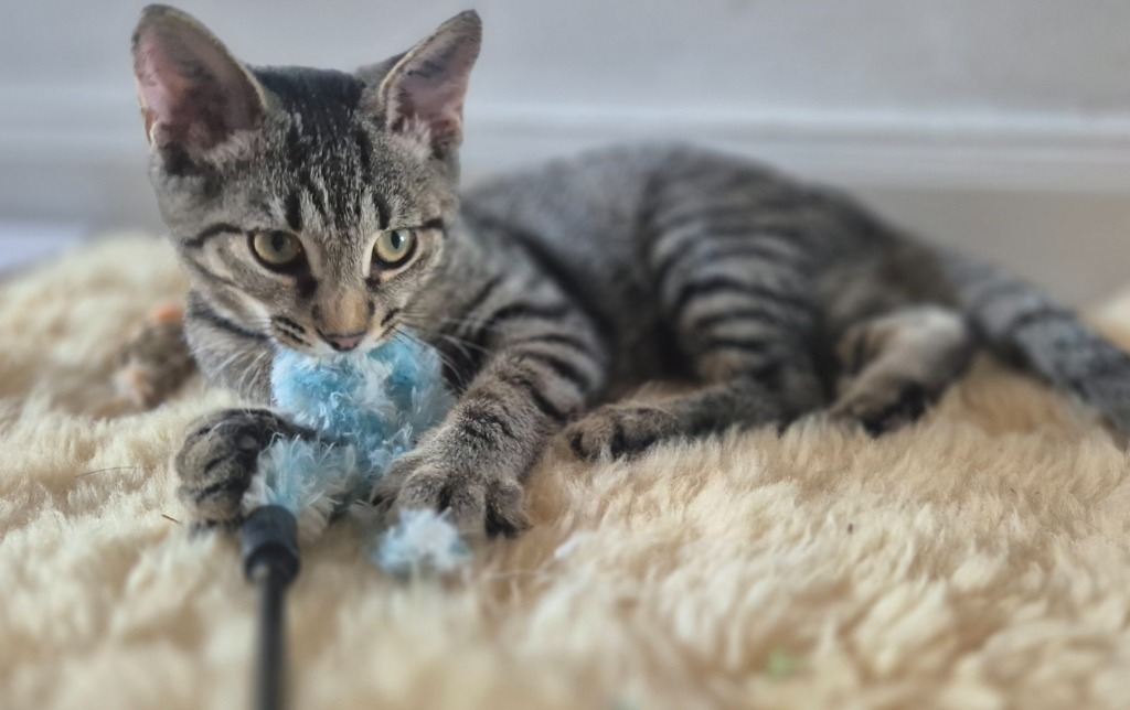 Mini er en legesyg og nysgerrig lille fyr, der gerne jagter både mus med små fjer såvel som snacks og ruller sig i både tæpper og dyner. Han kan ved første møde godt virke lidt genert, men som regel tager nysgerrigheden over, så han varm...