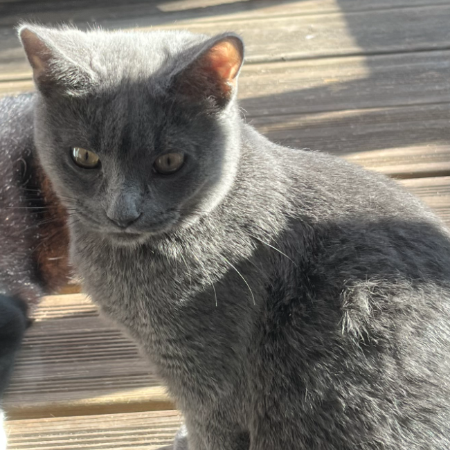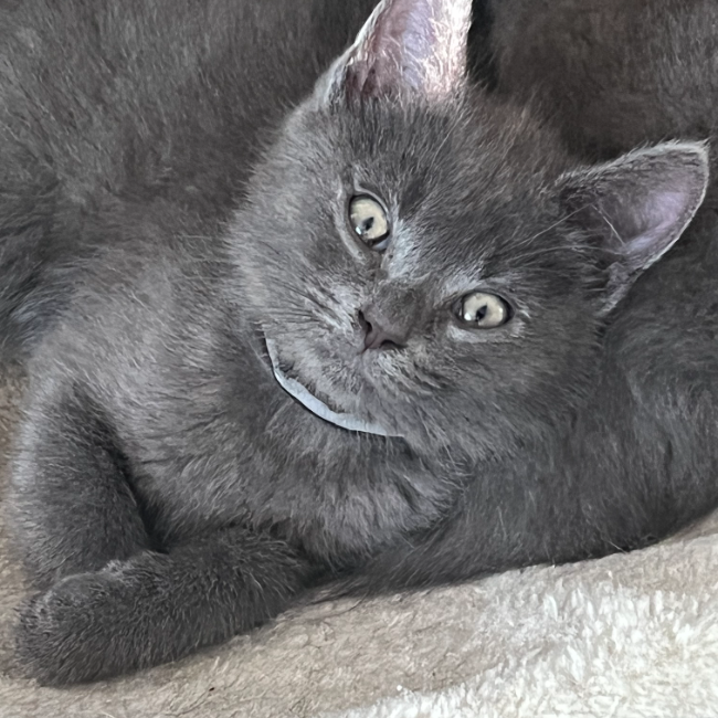 Diego er en ud af et kuld på 5, en rigtig flot blågrå hankat, muligvis med noget russian blue i sig, og han ligner sin mor. Hvis du har efterladt et stykke afklip, når du feks har åbnet en pose et eller andet, så "stjæler" han ofte stykket, og løber stolt afsted med det i munden, som om han er verdens største jæger. Han er kælen og legesyg, ganske lige som en killing skal være, han ønsker sig bare sin egen familie.